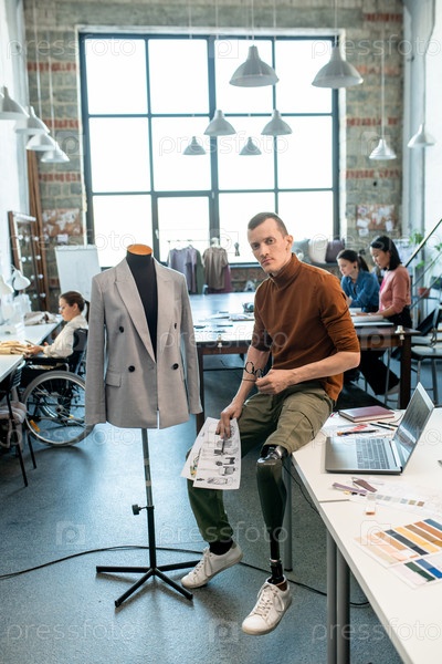 Молодая модельер-инвалид с эскизами сидит за столом против занятых коллег