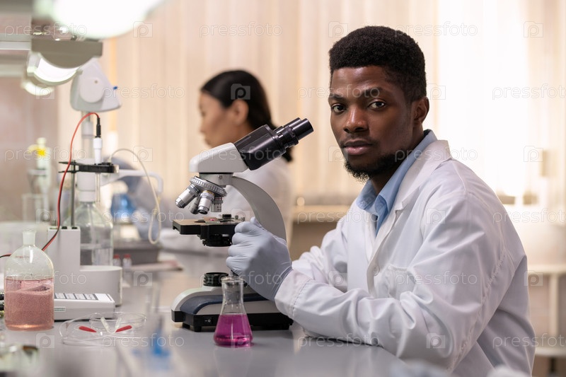 Молодой африканский химик с микроскопом