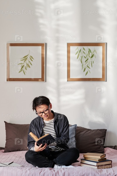 Улыбающийся азиатский студент-мужчина в рубашке сидит со скрещенными ногами и читает учебник в уютной комнате