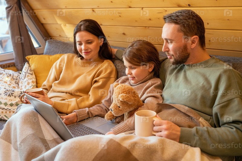 Счастливая молодая семья в повседневной одежде смотрит онлайн-фильм на экране ноутбука