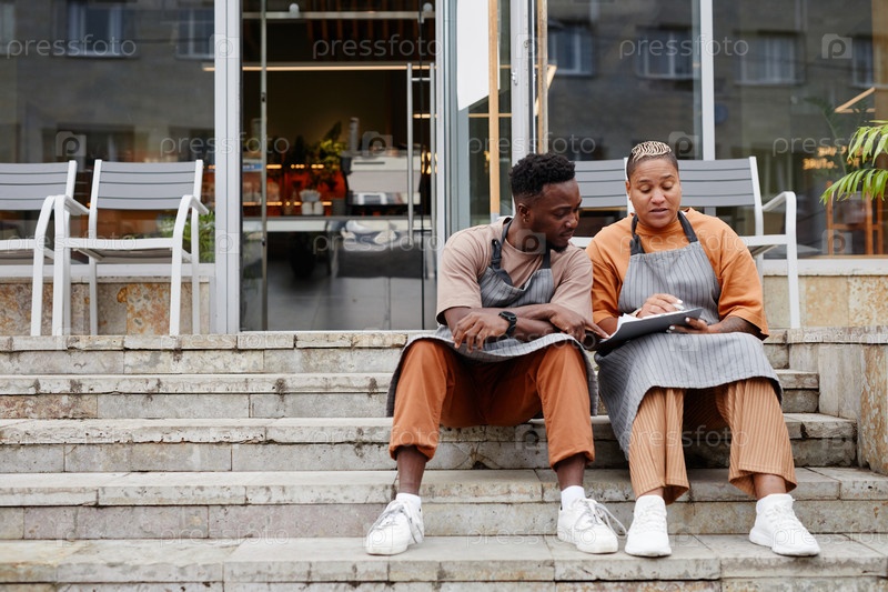 Работники кафе сидят на открытом воздухе