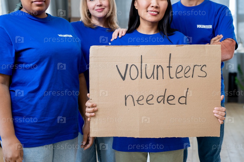 Группа молодых волонтеров, держащих плакат с объявлением