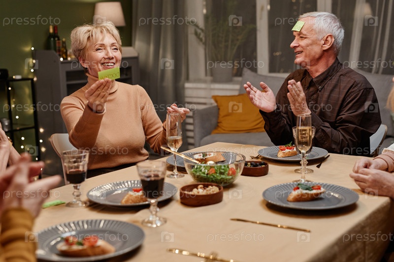 Веселые пожилые люди играют в гадательную игру