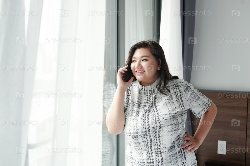 Веселая женщина делает телефонный звонок