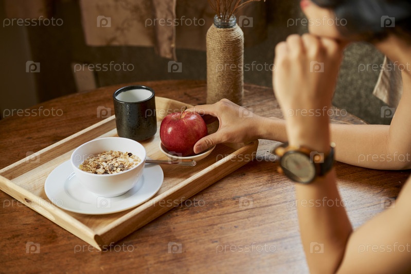 Женщина, берущая красное яблоко