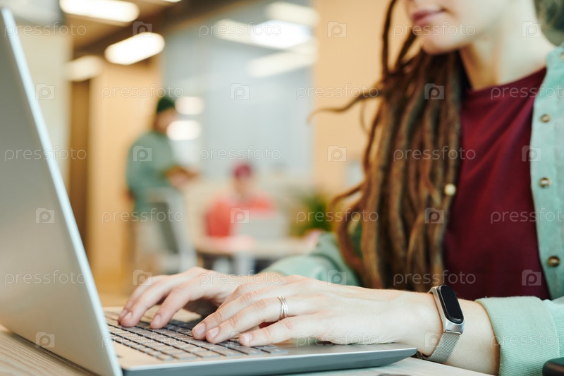 Руки молодого современного офисного менеджера в повседневной одежде над клавиатурой ноутбука