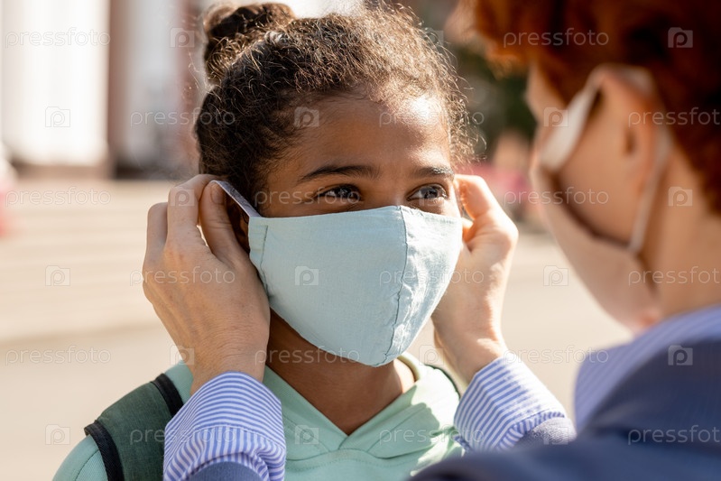 Женщина надевает защитную маску на лицо своей приемной дочери смешанной расы