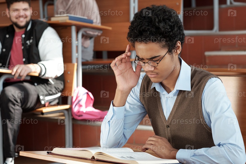 Мужчина смешанной расы пытается сконцентрироваться во время чтения