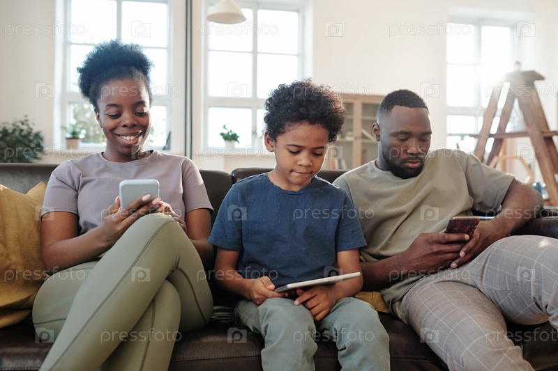Молодая семья отца, матери и милого маленького сына используют мобильные гаджеты, сидя на диване