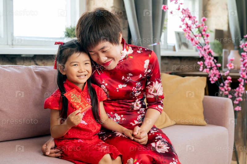 Счастливая китайская женщина обнимает свою маленькую дочь