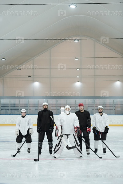 Хоккейные игроки с тренером стоят на ледовом катке в ожидании матча