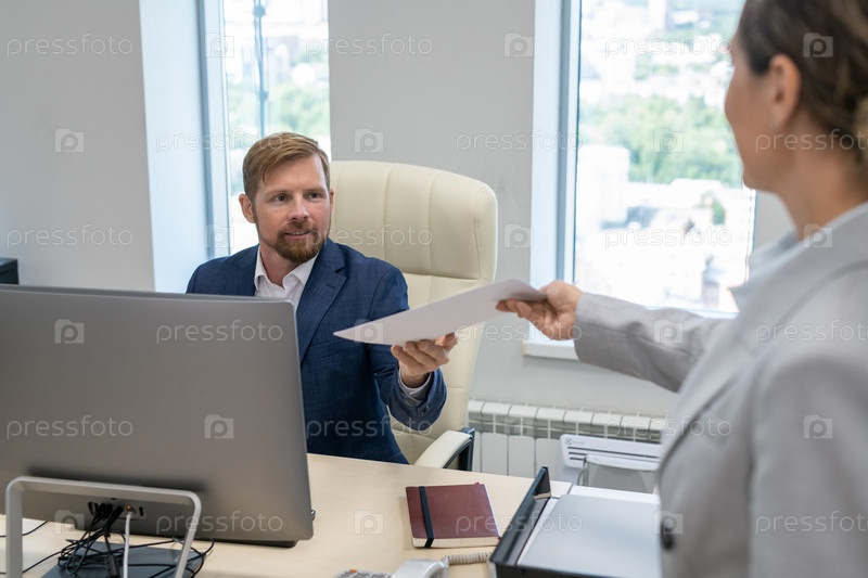 Молодой бизнесмен принимает финансовые документы, подаренные его коллегой