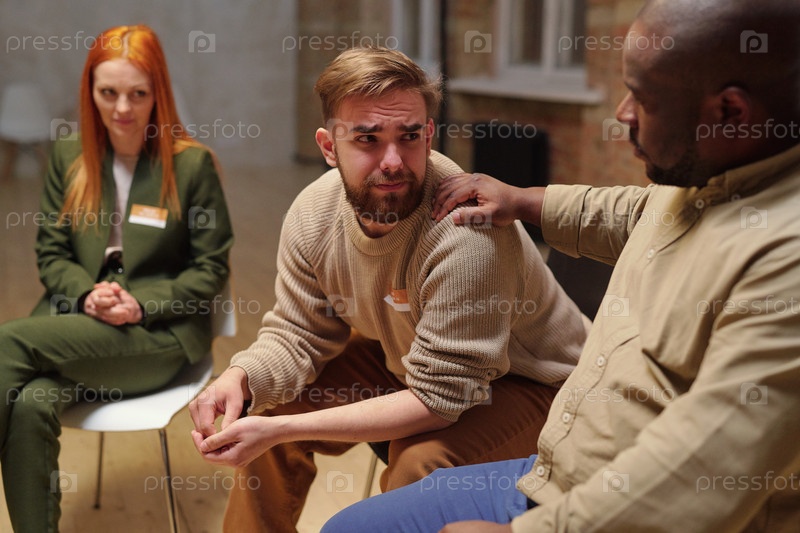 Молодой бородатый мужчина плачет, глядя на африканского парня, поддерживающего его
