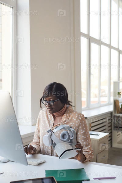 Афроамериканская женщина держит VR-гарнитуру в офисе