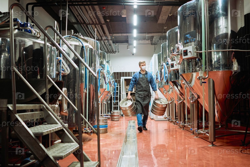 Молодой мужской работник современной пивоварни в рабочей одежде и защитной маске, несущий две цистерны