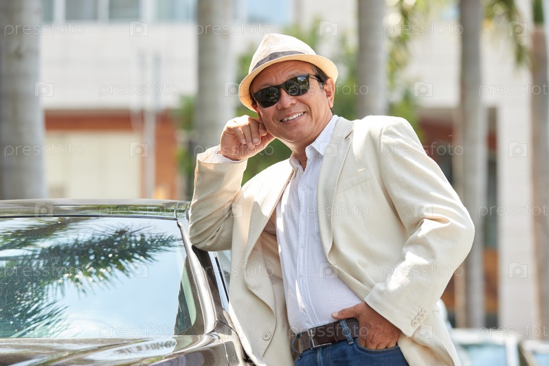 Портрет азиатского мужчины, опирающегося на машину