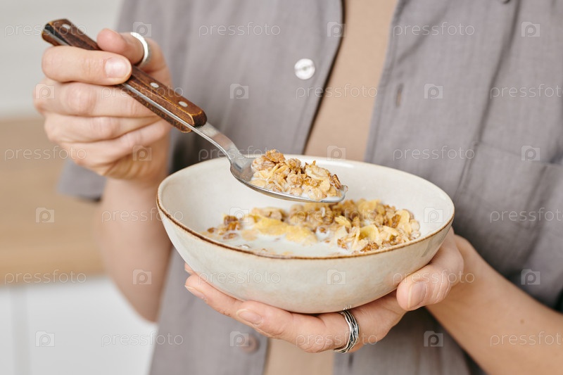 Руки женщины, держащей миску с мюсли