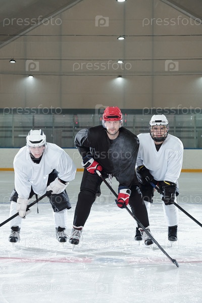 Современные хоккеисты в спортивной форме тренируются на ледовом катке перед игрой