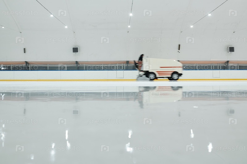 Белый грузовик или машина для сглаживания льда, движущиеся вдоль ледового катка на спортивном центре