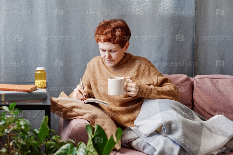 Горизонтальный снимок зрелой женщины с гриппом, которая сидит дома, работает над чем-то, делает заметки в блокноте и пьет чай