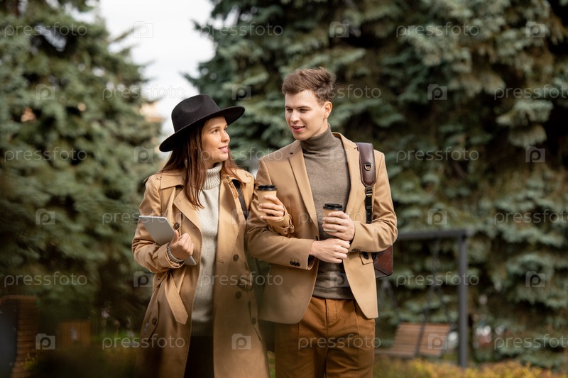 Молодые ласковые свидания со стаканами кофе прогуливаются среди фиртреев