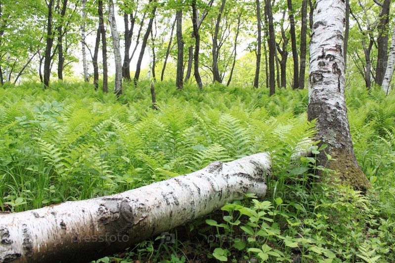 Упавший ствол березы в летнем лесу