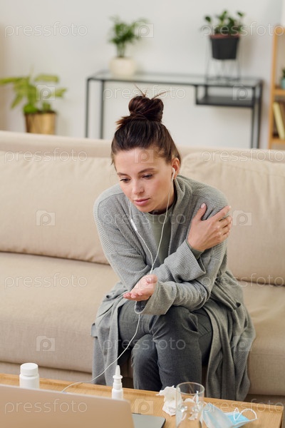 Молодая больная женщина описывает симптомы онлайн-врачу, сидя на диване