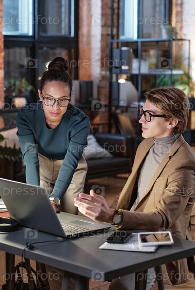 Руководитель проекта-женщина с волосками смотрит на экран ноутбука, анализируя интернет ресурсы со специалистом по маркетингу в темном офисе
