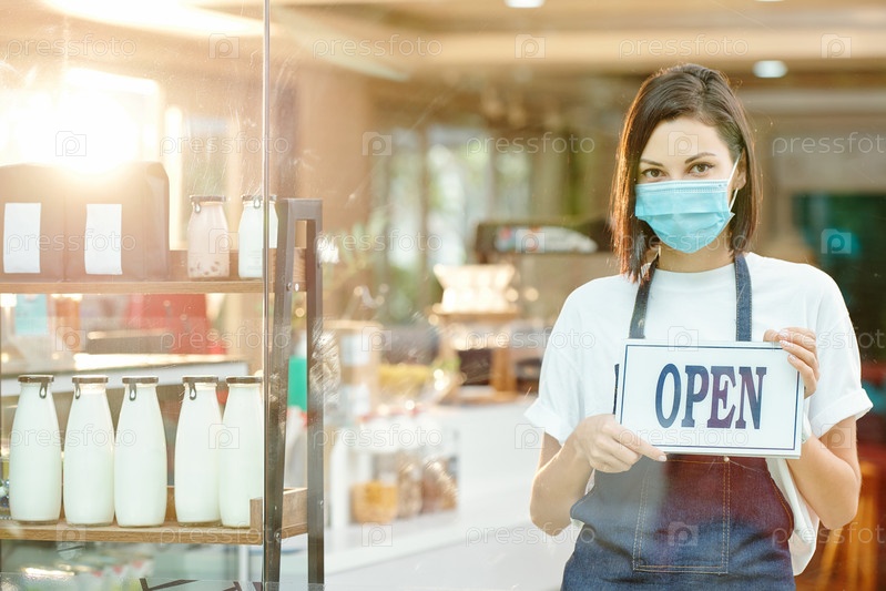 Владелец магазина показывает открытый знак