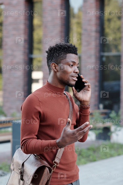 Хорошо одетый африканский бизнесмен объясняет что-то по телефону