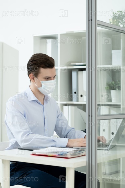 Молодой бизнесмен в защитных масках и формальной одежде создает сети в офисе