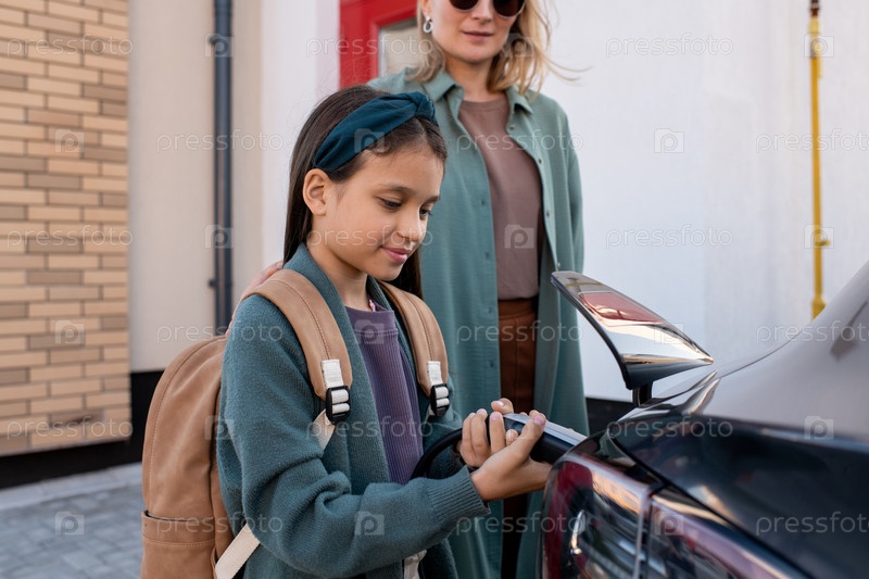 Маленькая девочка с рюкзаком помогает матери заряжать аккумулятор EV