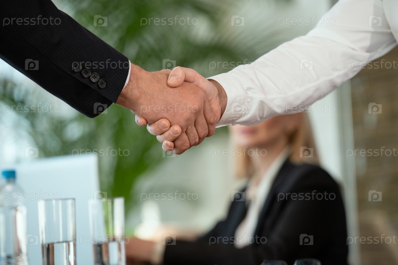 Успешный бизнесмен или делегат приветствует своего иностранного партнера рукопожатием