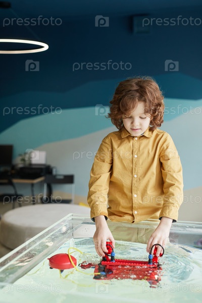 Милый мальчик играет с роботизированной лодкой