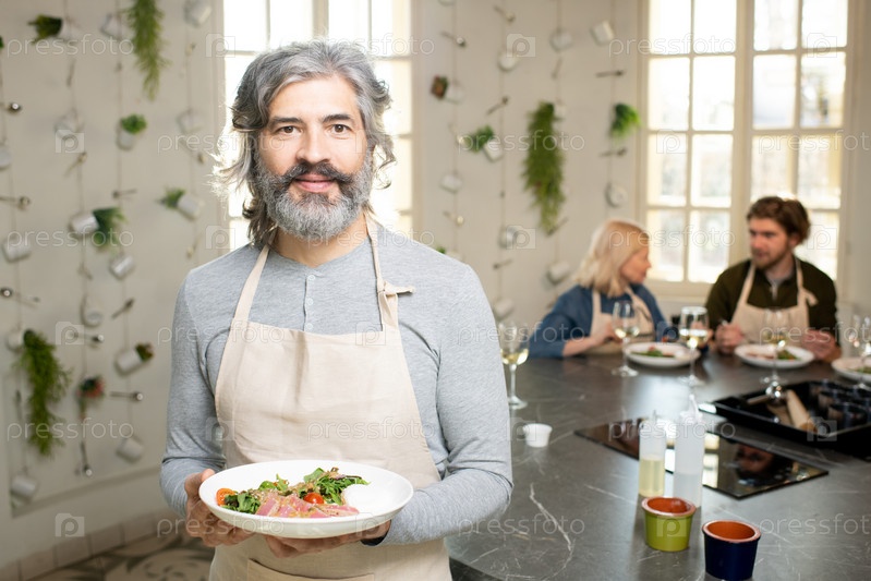 Зрелый бородатый мужчина в пуловере и фартуке держит тарелку с самодельным овощным салатом и мясом