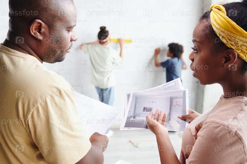 Молодая африканская женщина и ее муж обсуждают документы с черновиком и интерьером гостиной