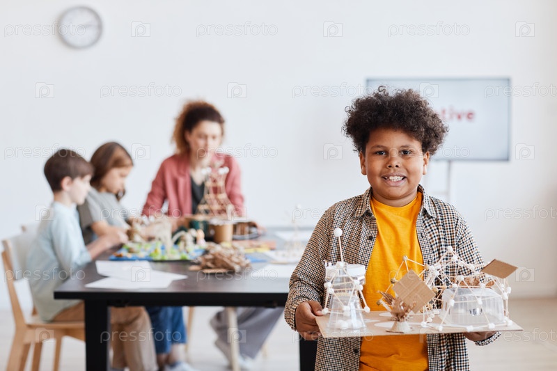 Афроамериканский мальчик представляет проект в школе