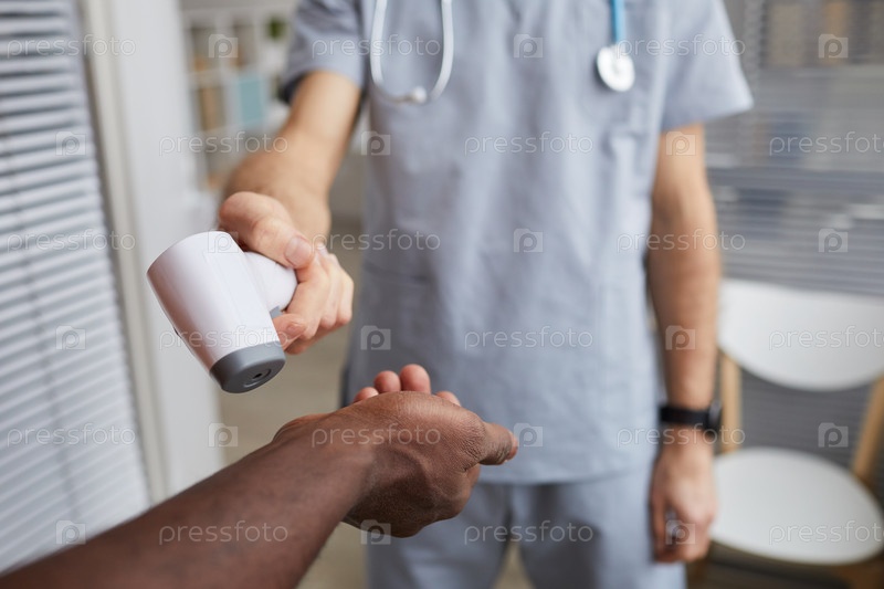Доктор указывает на инфракрасный термометр под рукой