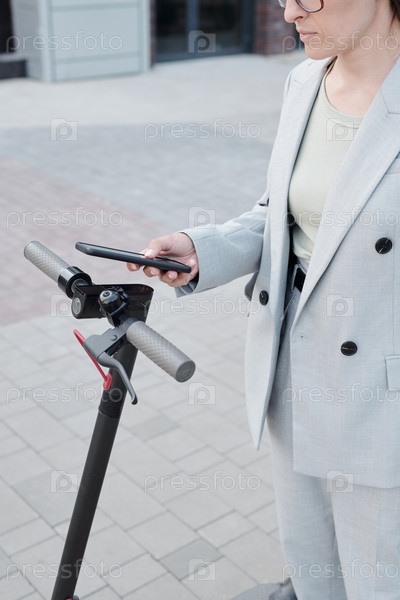 Современная женщина в костюме собирается на какое-то время арендовать скутер