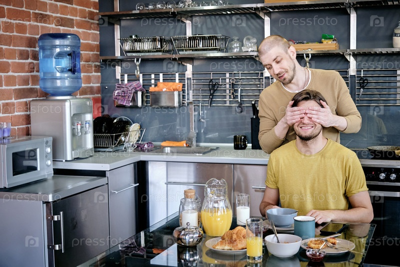 Один из двух мужчин покрывает глаза своего бойфренда руками