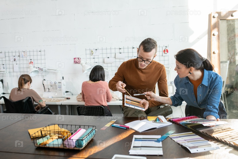 Молодые модные дизайнеры выбирают цвета и текстиль для новой коллекции против двух женщин, шиющих