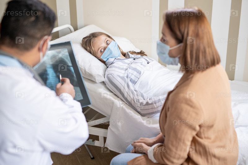 Молодая больная блондинка смотрит на своего врача и друга, обсуждающих рентгеновское изображение
