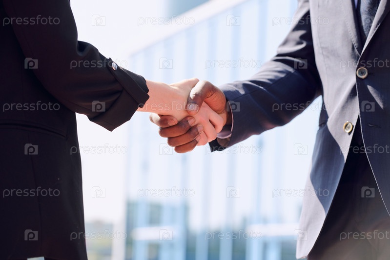 Пожимание рук молодых межкультурных деловых партнеров в костюмах, стоящих против современного здания