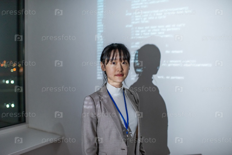 Молодая азиатская бизнесвумен в формальной одежде стоит в классе