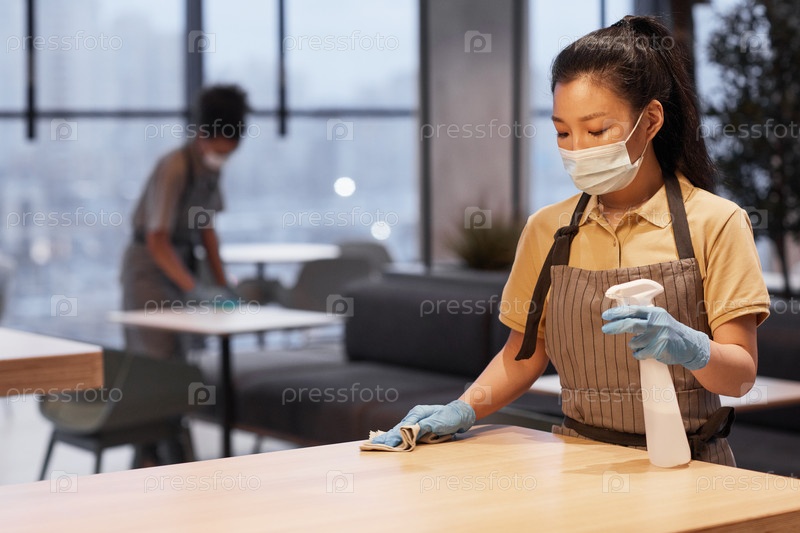 Молодая женщина дезинфицирует столы в кафе