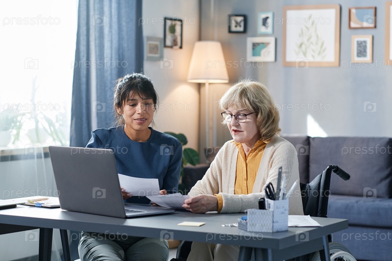 Пожилая женщина, оплачивающая счета онлайн with volunteer