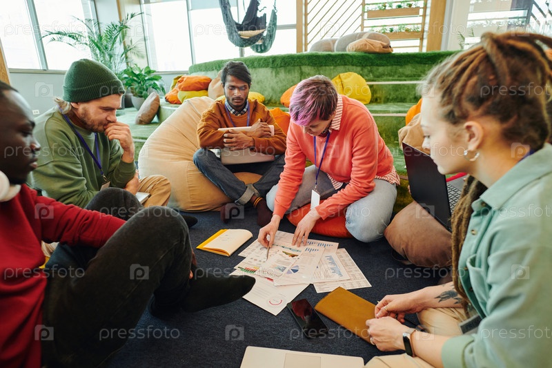 Один из нескольких межкультурных финансовых менеджеров, указывающих на диаграмму на бумаге