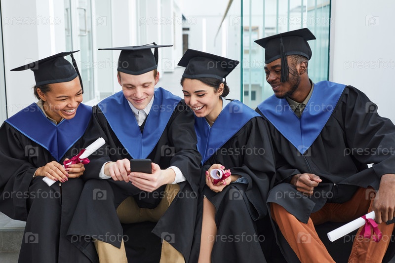 Разнообразная группа выпускников колледжей, сидящих на ступеньках вместе