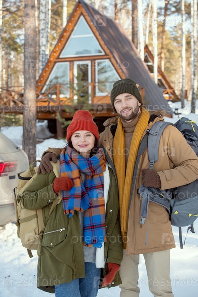 Молодая любящая пара с большими рюкзаками стоит перед камерой снаружи