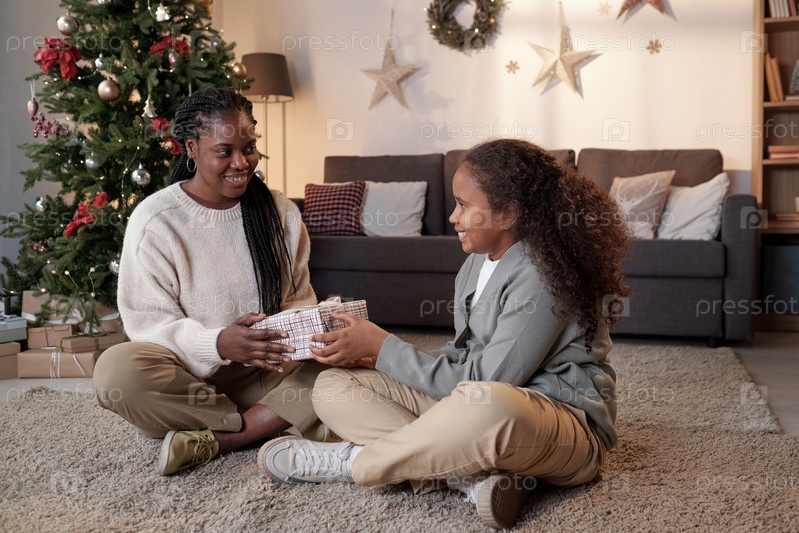 Счастливая молодая мать и милая дочь, держащие коробки с подарками